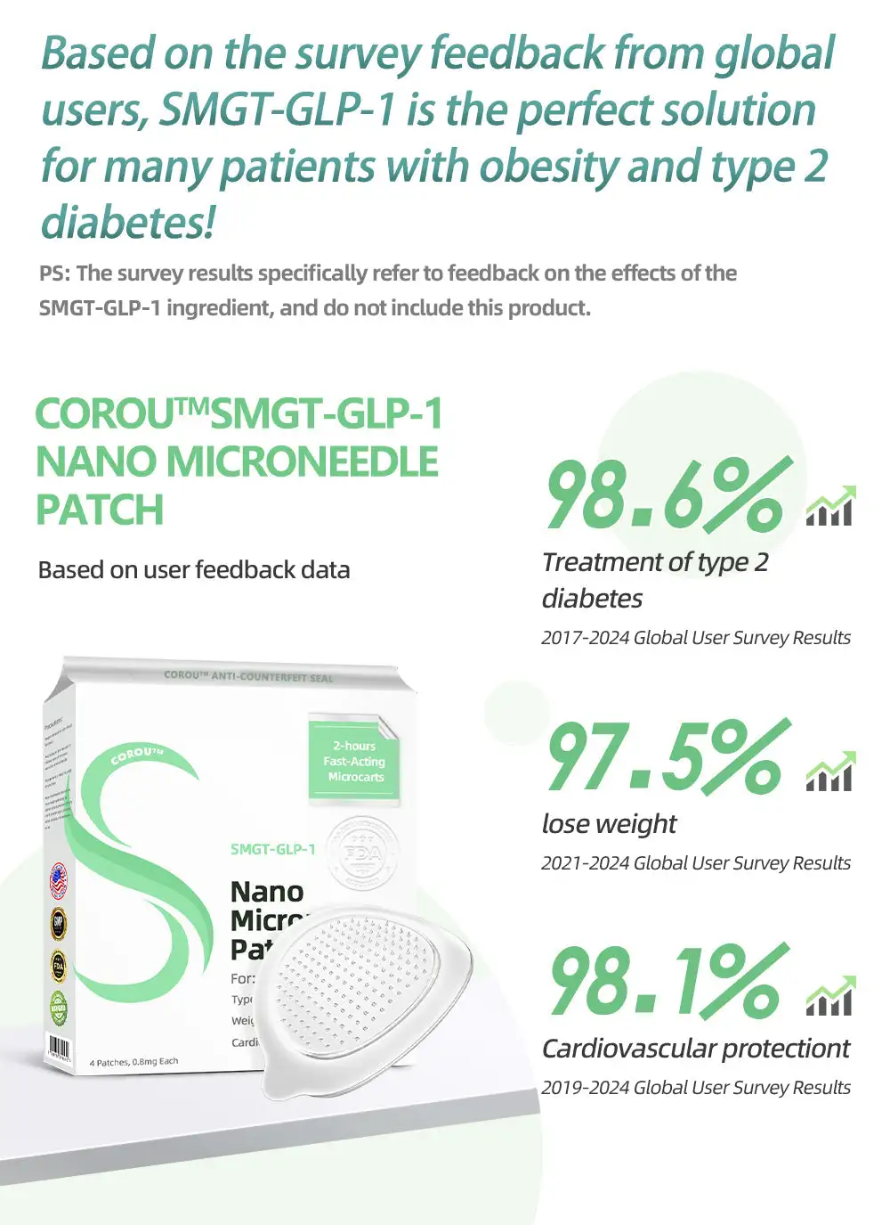 The COROU™ SMGT-GLP-1 Nano Microneedle Patch offers a long-lasting. slow release of the medication. ensuring a stable effect over 24 hours without causing any discomfort. With the same dosage and price. it can maintain up to 20 times longer-lasting effects (similar to the difference between an IV drip and a single injection).
