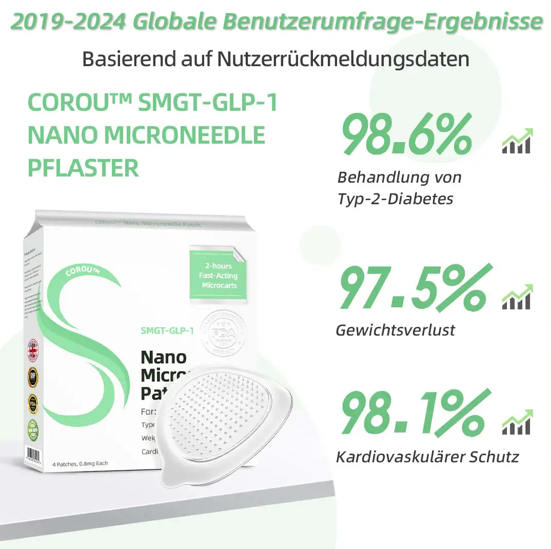 The COROU™ SMGT-GLP-1 Nano Microneedle Patch offers a long-lasting. slow release of the medication. ensuring a stable effect over 24 hours without causing any discomfort. With the same dosage and price. it can maintain up to 20 times longer-lasting effects (similar to the difference between an IV drip and a single injection).