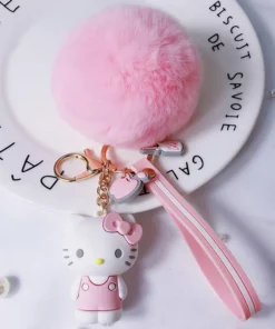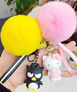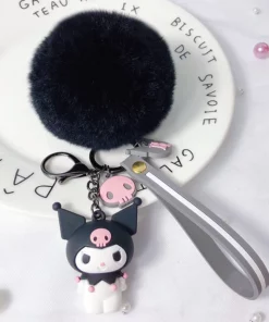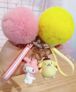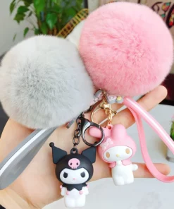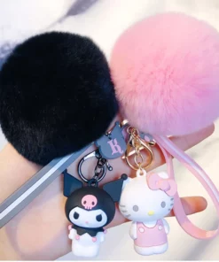 Hello Kitty Sanrio Kuromi Penguin Frog Dog Cat Cute Keychains with Fluffy Rabbit Fur Ball Women Girl Bag Pendant Keyring Gifts