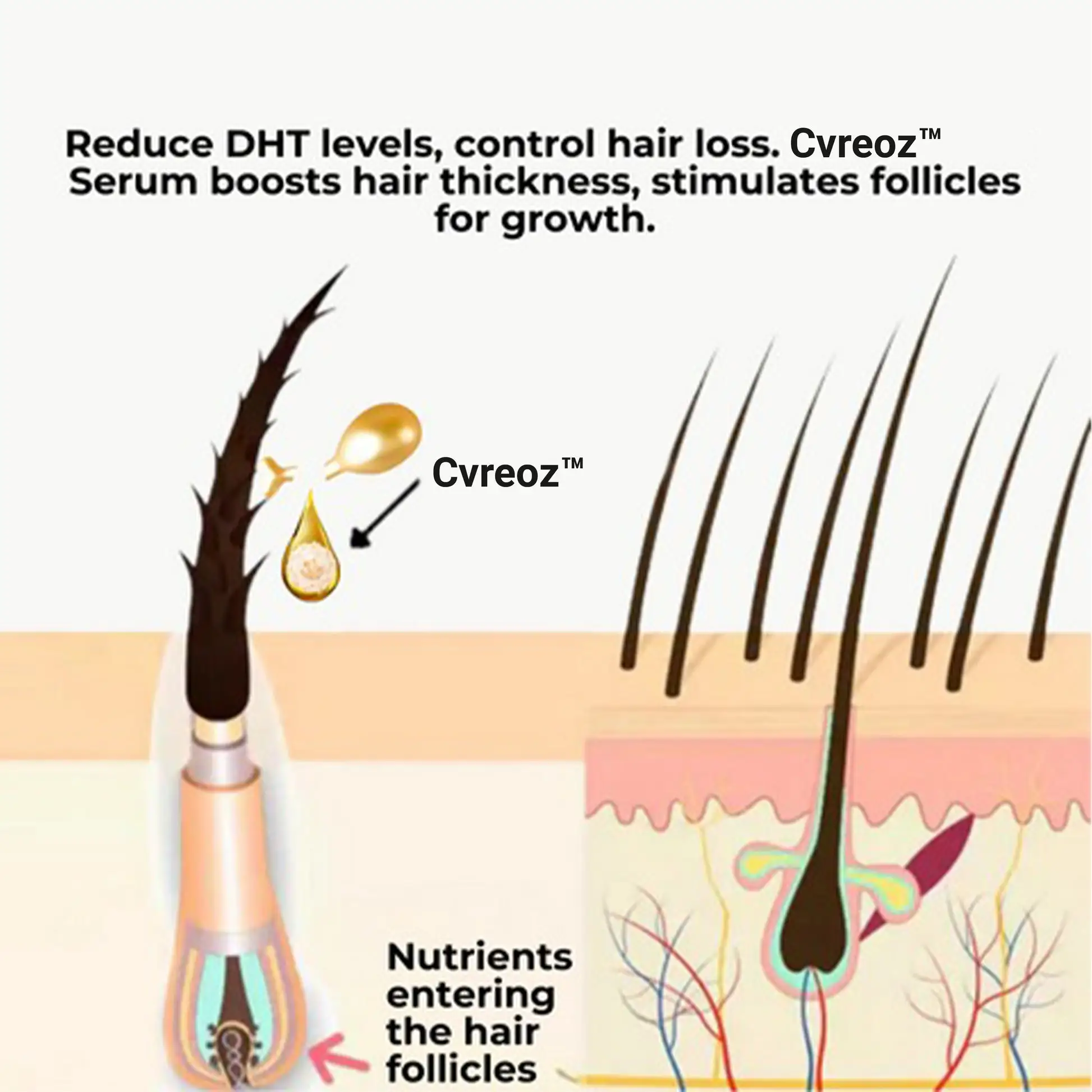 - Awakens Dormant Follicles: Cvreoz™ stimulates dormant hair follicles, encouraging them to enter the growth phase and produce stronger, healthier hair.