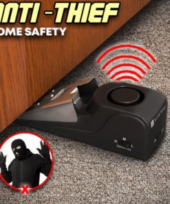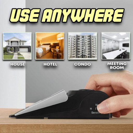Maximum security. Whether you’re in a strange home, away at a hotel, all you have to do is slide this battery-operated security door stop beneath your door to create a loud, unmistakable alarm sound any time door pressure is applied.