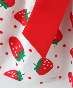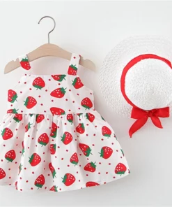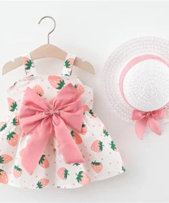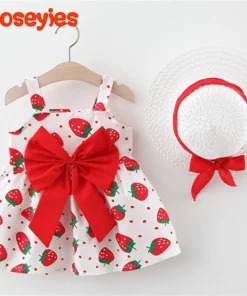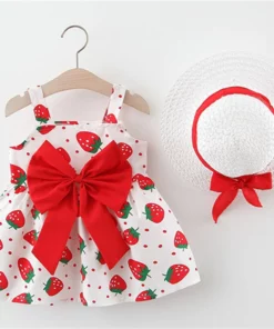 Summer Baby Girl’s Dress Small Round Dot Strawberry Print Chest Bow Daily Casual Dress with Hat