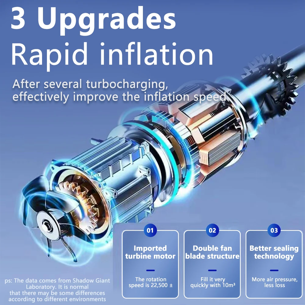 1. Rapid Inflation with Pure Copper Motor: The portable air compressor features airflow boosting technology powered by a pure copper motor, enabling a powerful and rapid inflation in just 10 seconds. This efficient mechanism significantly increases the inflation speed, ensuring you’re back on the road in no time.