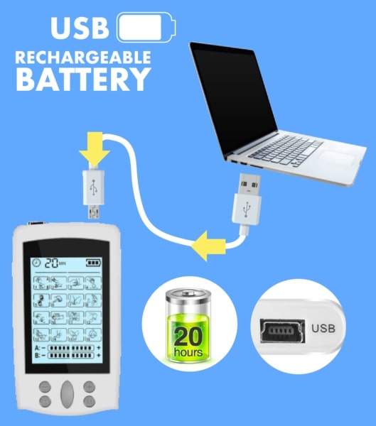 Easy clean up after maximum performance with Self Stick 45 uses for longer lifespan. It may be easy to find compatible electrodes (2mm Pigtail Tens Unit Pads) on the marketplace. It can provide up to 20 hours continuous use and can be connected directly to a USB outlet or wall socket to charge. This means that you don’t have to worry about interruptions in treatment.