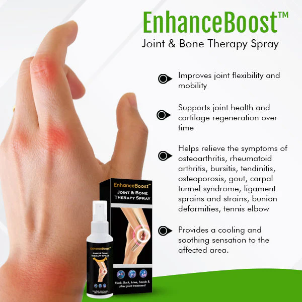 EnhanceBoost™ Joint & Bone Therapy Spray is designed to provide targeted relief for joint and bone pain. The spray works by delivering a combination of natural ingredients directly to the affected area.