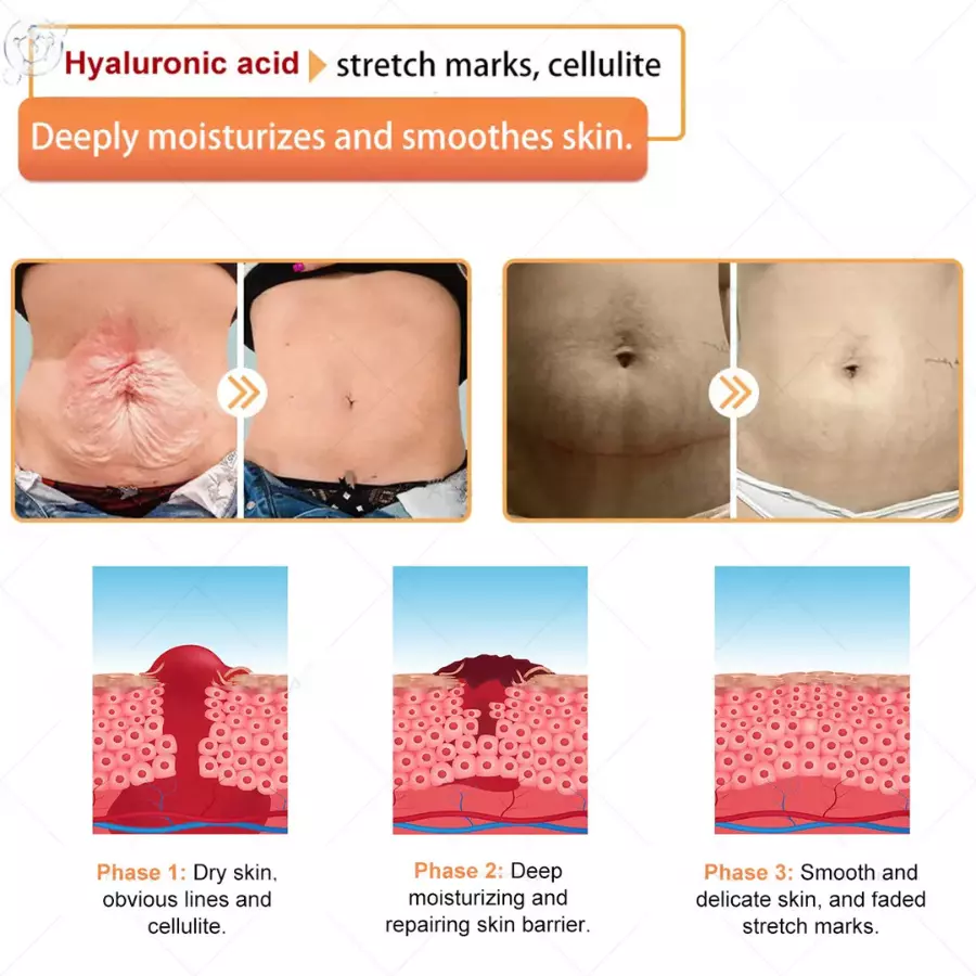 - Hyaluronic Acid: Deeply hydrates the skin and helps reduce the appearance of stretch marks.