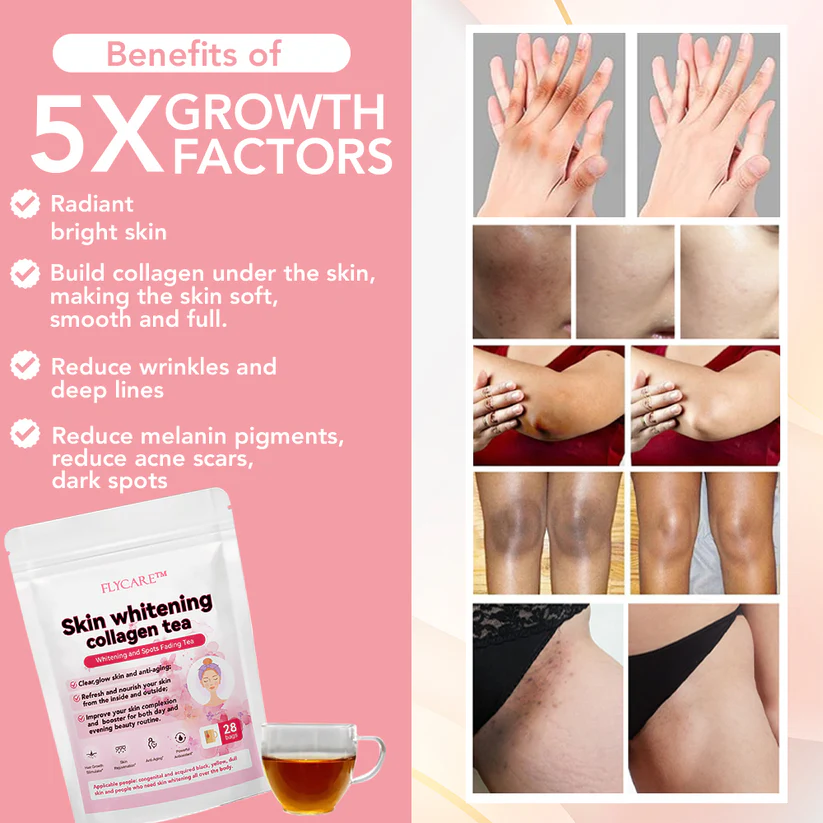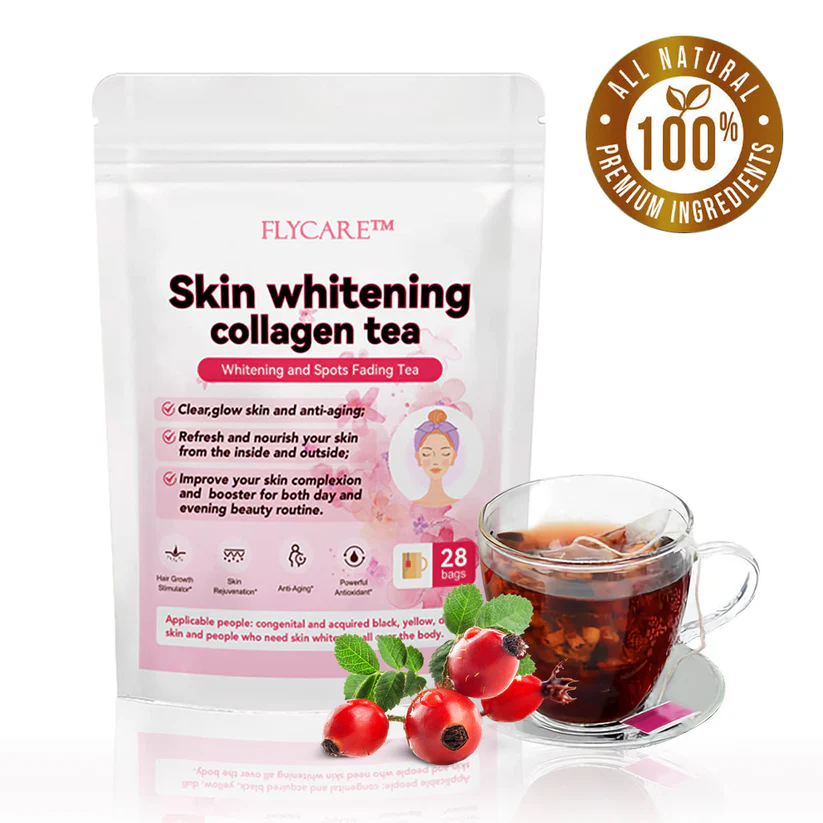FLYCARE™ GlowLeaf Skin Whitening Collagen Tea effectively addresses hyperpigmentation, delivering a natural glow. Infused with potent herbs, this tea works from within to eliminate dark spots, brighten your complexion, and restore luminosity.