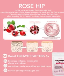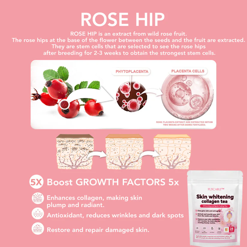 FLYCARE™ GlowLeaf Skin Whitening Collagen Tea leverages the power of rose hip and L-Cysteine, known for inhibiting melanin production. By reducing the activity of tyrosinase, the enzyme that creates melanin, the tea aids in lightening dark spots and evening out skin tone, resulting in a brighter complexion over time.