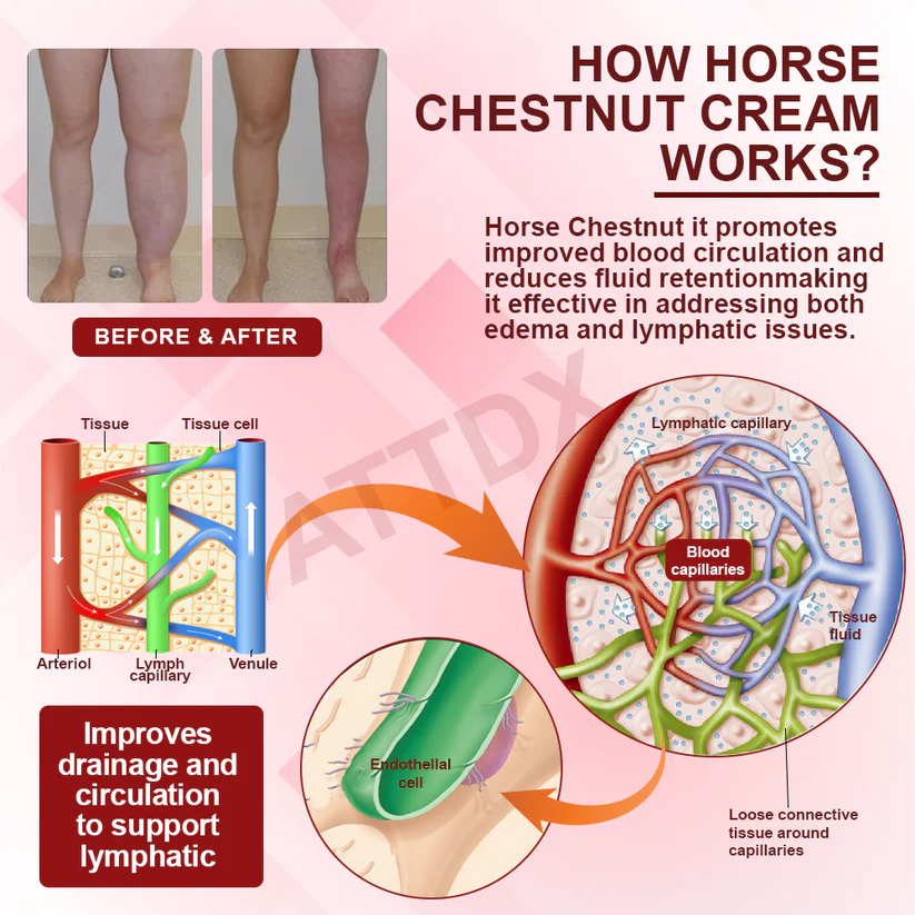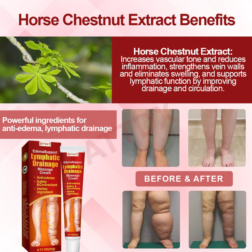 ATTDX™EdemaSupport Lymphatic Drainage Massage Cream harnesses the potent properties of Horse Chestnut Extract to effectively combat edema and swelling.