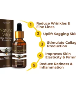 NaturalVital is proud to introduce our flysmus™ NaturalVital Bee Venom Essence, a product crafted with utmost care and precision to harness the incredible potential of this newfound skincare superstar. Bee venom has swiftly gained popularity for its remarkable benefits. It is proven that it can plump and firm your skin, effectively reducing the appearance of fine lines and wrinkles. But that’s not all; bee venom can prevent aging and blemish-free skin by improving blood circulation.