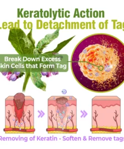 The TagOff Treatment Serum utilizes the healing power of comfrey, to effectively and gently remove skin tags. Central to this process is the enzyme allantoin, found in comfrey, which is scientifically proven to promotes the growth of new, healthy skin cells around the tag while simultaneously encouraging the shedding of old, dead skin cells. This dual action leads to the gradual and natural disintegration of the skin tag as fresh cells replace the older, damaged ones.