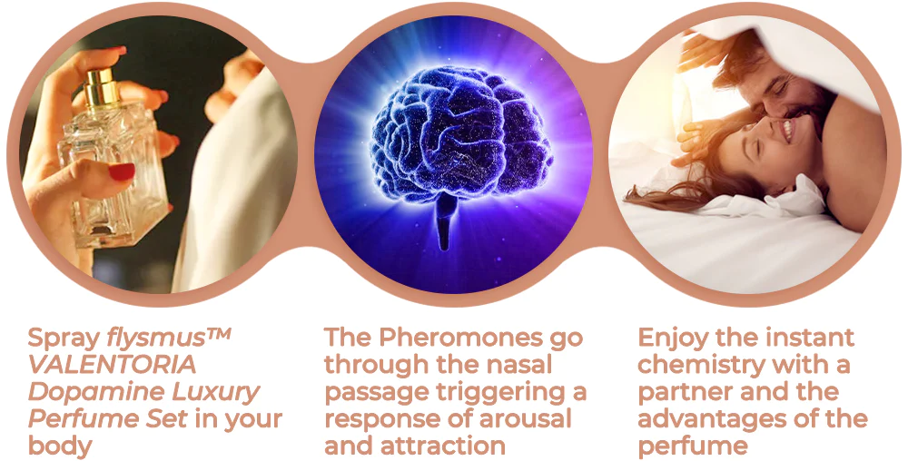The flysmus™ VALENTORIA Dopamine Luxury Perfume Set elevates the subtle signals of attraction that emanate from a woman’s scent. Expanding upon its previous version, it introduces an extra layer of enchanting fragrance. Pheromones are naturally crafted to unveil information about an individual’s immune system, and a woman’s fragrance provides additional subconscious insights. Men are instinctively attracted to this scent, as their senses become heightened, compelling them to be drawn towards the wearer.