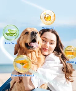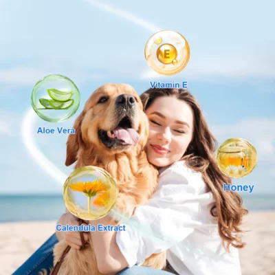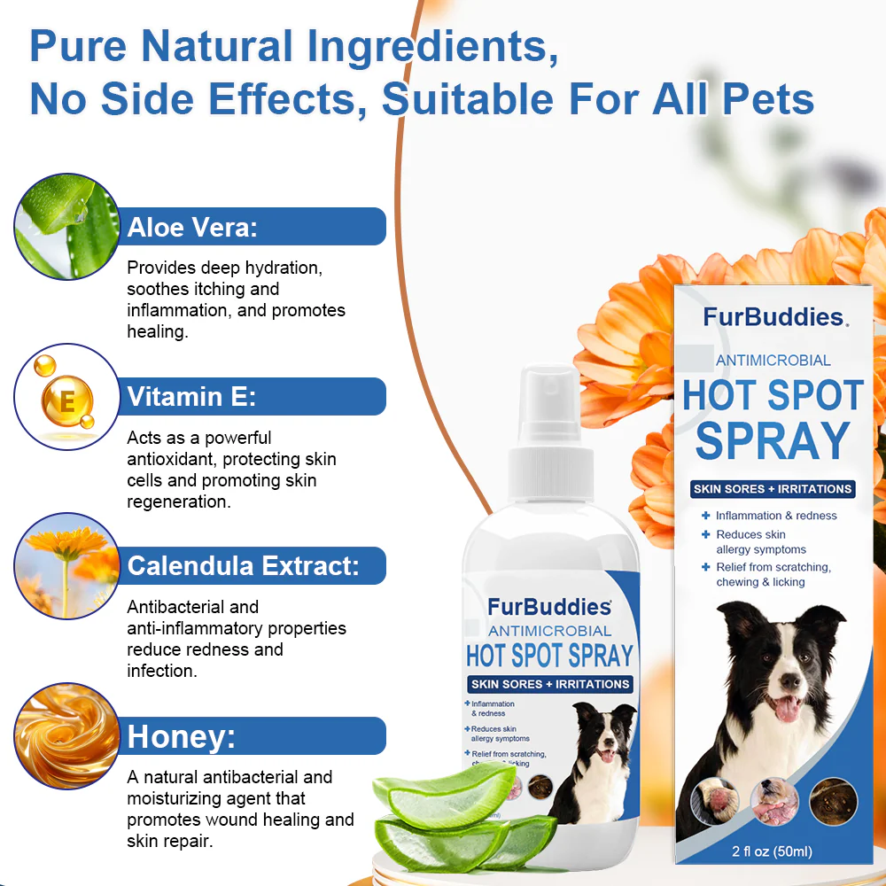 Our FurBuddies® Hot Spot Spray addresses common dog skin issues with a powerful blend of natural ingredients: Aloe Vera and Honey soothe and deeply moisturize, reducing itching and allergies by 98.5%; Vitamin E and Calendula Extract combat inflammation and infections, effectively treating 97.6% of cases; and Honey promotes rapid wound healing, repairing 96.5% of damaged skin. This comprehensive formula provides relief from itching, infections, and skin damage, ensuring healthier skin and overall well-being for your dog.