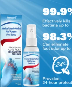 Furzero™ Advanced Medical Grade Herbal Nail Fungus Foot Spray is a scientifically proven, fast-acting solution for bacterial foot disorders. It has a 99% efficacy approval rating and is formulated to target a variety of foot problems for optimal foot health. It kills bacteria, yeast and mold on contact, provides immediate relief and eliminates 99.99% of bacteria in less than 1 minute. The spray helps maintain the skin’s pH balance and lasts for 7 days. Spray contains all natural ingredients that are safe to use and promote healing of dry, brittle nails and damaged skin. Effective treatment for fungal infections, grey nails, nail infections, athlete’s foot and bad odor.