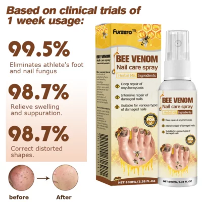 Furzero™ Bee Venom Nail Psoriasis Treatment Spray, developed by dermatologists, harnesses potent antifungal and anti-inflammatory properties from bee venom. It penetrates deep into the nail bed, addressing the root causes of nail issues and soothing inflammation and discomfort. Unlike conventional treatments, Furzero™ offers a clean and easy solution to nail fungus problems with its natural formula, ensuring gentle yet effective treatment without harsh chemicals or side effects.