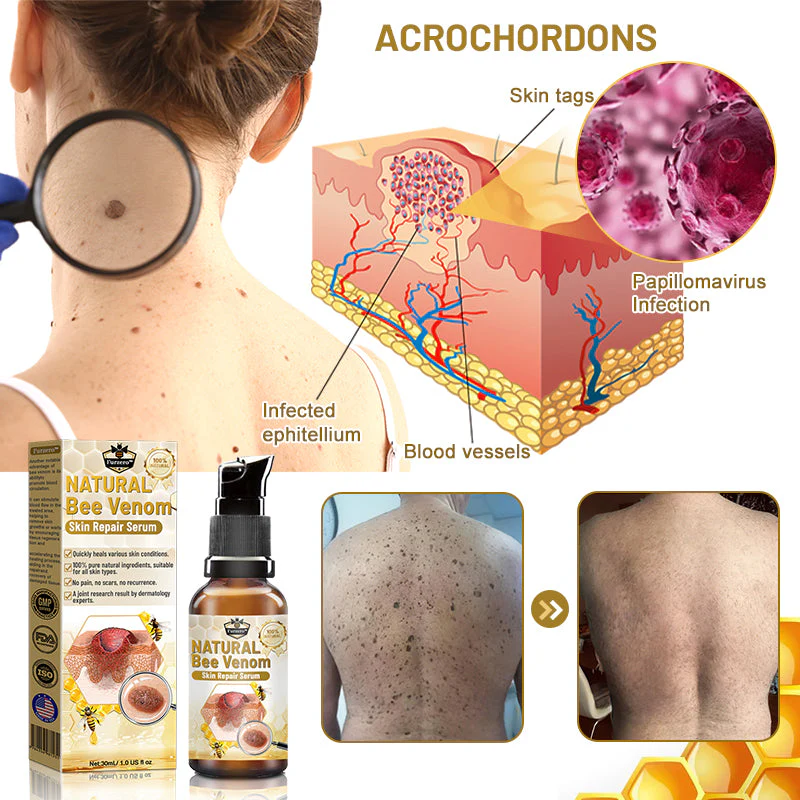 Furzero™ Natural Bee Venom Skin Repair Serum is a solution that harnesses the powerful properties of bee venom to effectively target various skin imperfections, including skin tags, moles, warts, and spots. Infused with active compounds extracted from bee venom, this advanced formula breaks down and gently removes unwanted growths.