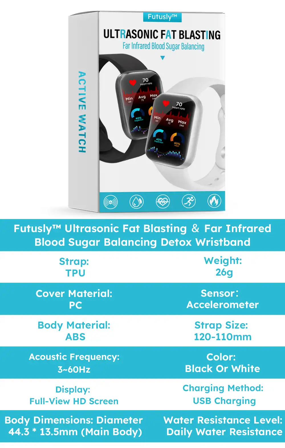 t sounds like the Futusly™ Ultrasonic Fat Blasting & Far Infrared Blood Sugar Balancing Detox Wristband is a cutting-edge product designed to offer a variety of health benefits, particularly for weight loss, blood sugar regulation, and overall wellness. Let’s break down the main claims and benefits: