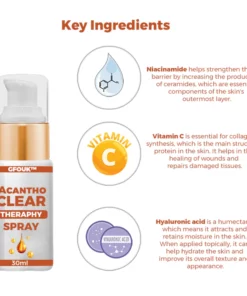 The GFOUK™ AcanthoClear Therapy Spray contains a combination of natural ingredients that work together to help reduce the appearance of these patches and improve the overall health of the skin. Some of the ingredients in AcanthoGlow Therapy spray may include alpha hydroxy acids (AHAs), which can help to exfoliate the skin and promote cell turnover, as well as antioxidants, which can help to protect the skin from damage caused by free radicals.