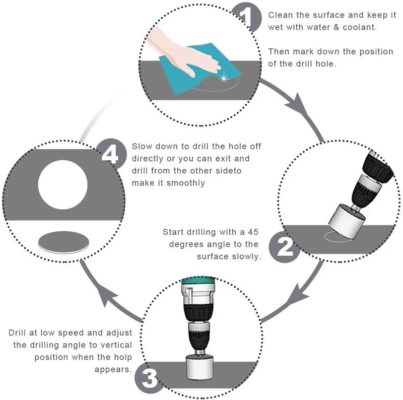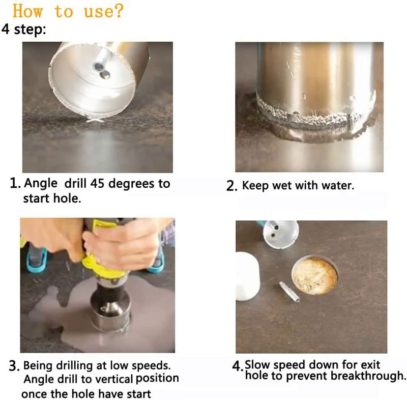 TIP: Can be used with a standard electric drill, Always use lubrication (water), otherwise the diamond core drill will burn. Warnings: Not for use on Concrete or for depths beyond about 2″; Water is required for lubrication when drilling.