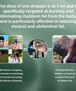 Studies have shown that 5ml of GLP-1 Drops Solution can burn up to about 100 grams of stubborn fat. And it takes a long time for us to burn 50 grams of fat through exercise (80 minutes of jogging. 92 minutes of swimming. 119 minutes of cycling. 64 minutes of jumping rope). The dose of one dropper is at 5 ml and is specifically targeted at burning and eliminating stubborn fat from the body. and is particularly effective in reducing visceral and abdominal fat.