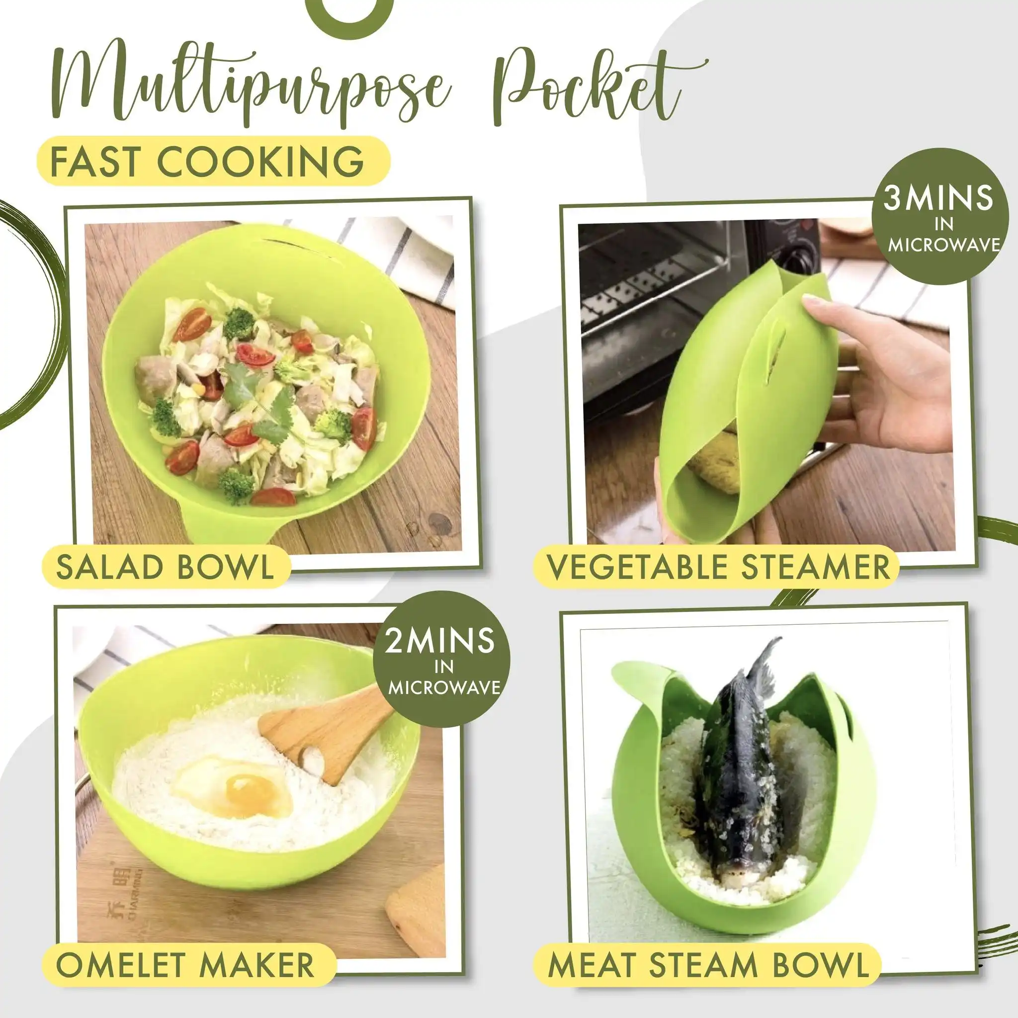 It’s a bowl and cooking Pocket! It is easy to use, carry and store food. Steam the chopped vegetables in the compartment, add your eggs and cheese. Stir and microwave for 1-2 minutes for a quick breakfast on the go!