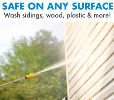 Safely clean all dirty surfaces including wood, brick, concrete, sidings, plastic, glass and more. Guaranteed to be safe on any surface and will not strip wood, car paint or clear coat.