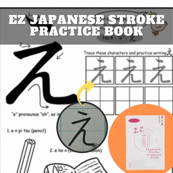 Step-by-step stroke order diagrams are provided for each character and individual boxes with grid lines to practice writing are found in Japanese Stroke Practice Book.