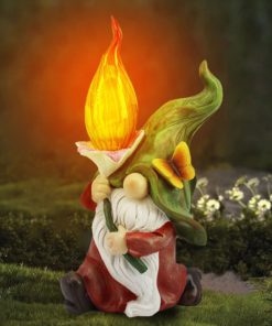 This is the only one with a sign (welcome) in his hand – the others have lighted gloves, birds, and other things in their hands, so this one is kind of special. The gnomes I have are set up on a small tiered plant stand that is directly across from my front gate so that people who open my gate to come to my front door will see these gnomes. I have this Welcome Gnome in the center on the top shelf which is pretty much eye level for most people. It’s a nice way to welcome people to my house before I ever open the door. He’s a cute gnome!