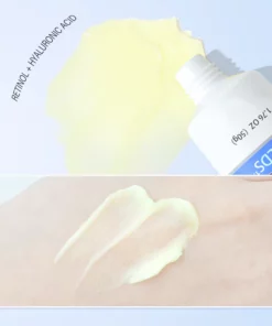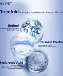 Retinol is a key ingredient known for its ability to stimulate collagen synthesis. By promoting collagen production, it enhances skin elasticity, reduces wrinkles, and improves overall texture. Additionally, palmitoyl peptide helps the skin retain moisture and stimulates elastin production, crucial for maintaining skin’s elasticity and combating sagging.