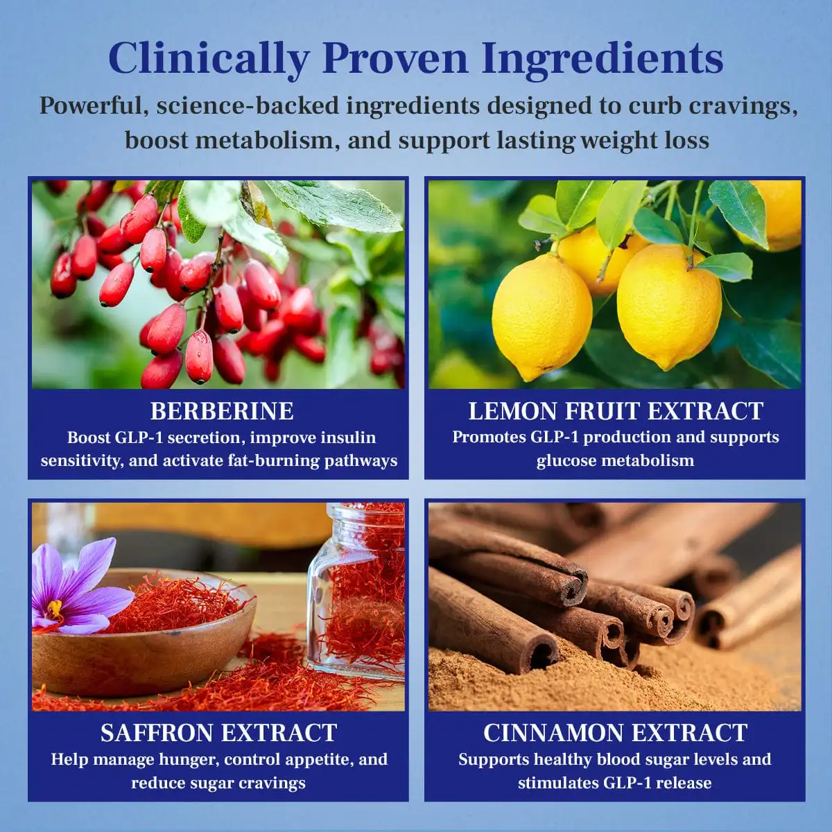 Lemon Fruit Extract: Contains high levels of eriocitrin, a powerful citrus flavonoid known for its antioxidant and metabolic-boosting properties. Studies suggest that eriocitrin supports GLP-1 production, a hormone that regulates appetite, enhances feelings of fullness, and promotes fat metabolism.