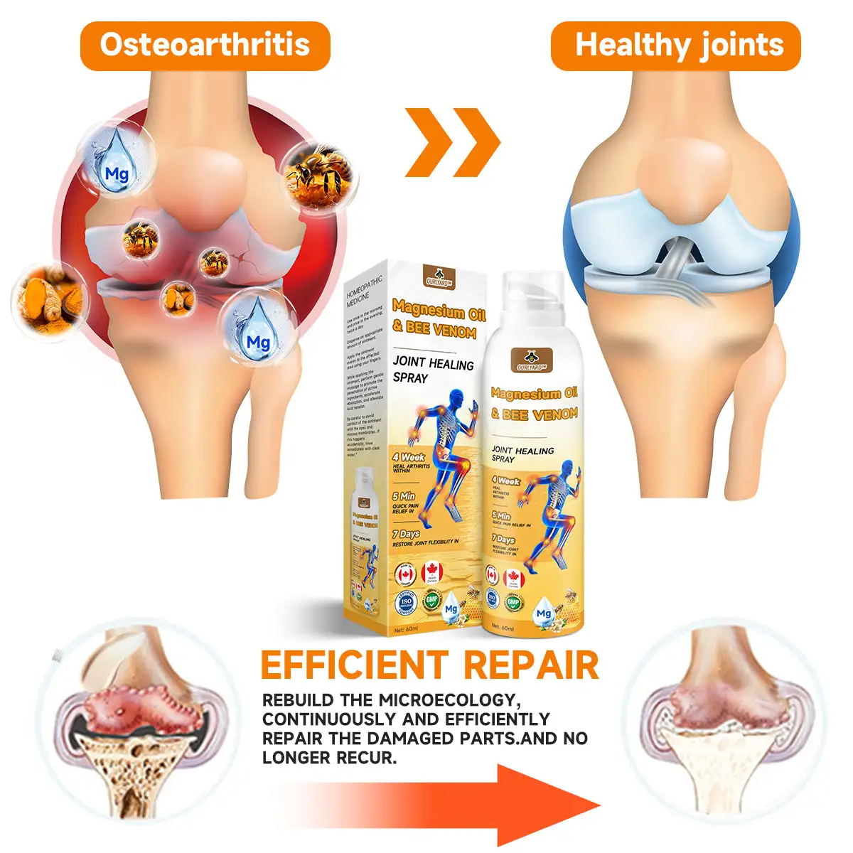 “As an orthopedic surgeon, I endorse Ourlyard™ Magnesium Oil & Bee Venom Joint Healing Spray for individuals suffering from joint and bone conditions such as osteoarthritis, rheumatoid arthritis, and other inflammatory disorders. This spary contains active ingredients like bee venom filtrate, glucosamine, and chondroitin, which work to alleviate inflammation, nourish joints, and enhance mobility. It also aids in rebuilding and restoring cartilage and bone tissue, alleviating pain and stiffness while eliminating harmful crystals that can accumulate in joints, thereby improving overall joint function.”