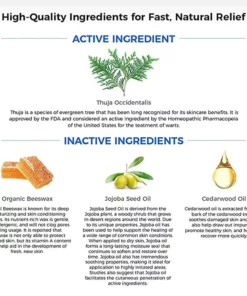 - Main ingredients: Thuja Occidentalis, Organic Beeswax, Jojoba Seed Oil, Cedarwood Oil, Silver Oxide, Zinc Oxide, Magnesium Oxide
