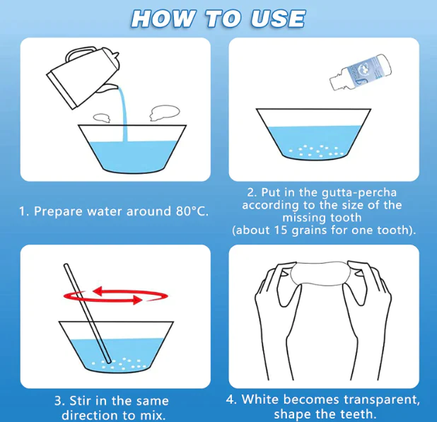 - 3、Remove the gel from the cup and let it cool for about 5 seconds. Then place the gel into the tusk slot so that you can glue the tusk to your own teeth and squeeze the gel into the gaps between your teeth and the inner sides of your teeth with your hands. This will make it all one complete, compatible tooth slot.