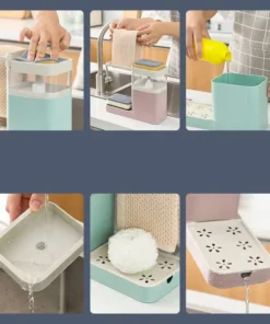 ALL-IN-ONE CONVENIENCE: 4-in-1 Countertop Soap Pump features a dish towel hanger, soap pump, sponge caddy, and a drain rack. The 4-in-1 design keeps your sink organized making your washing experience as easy.