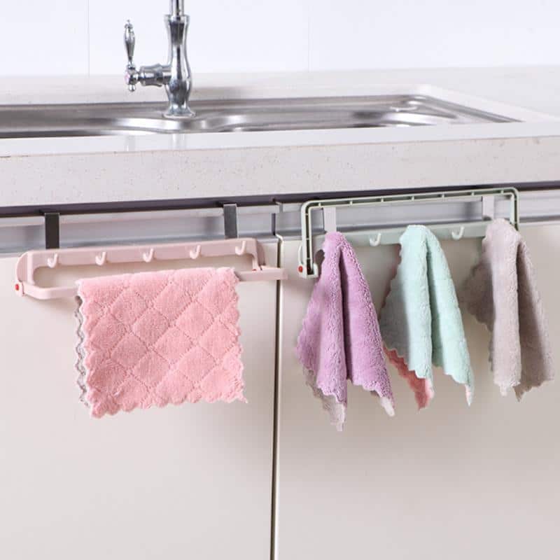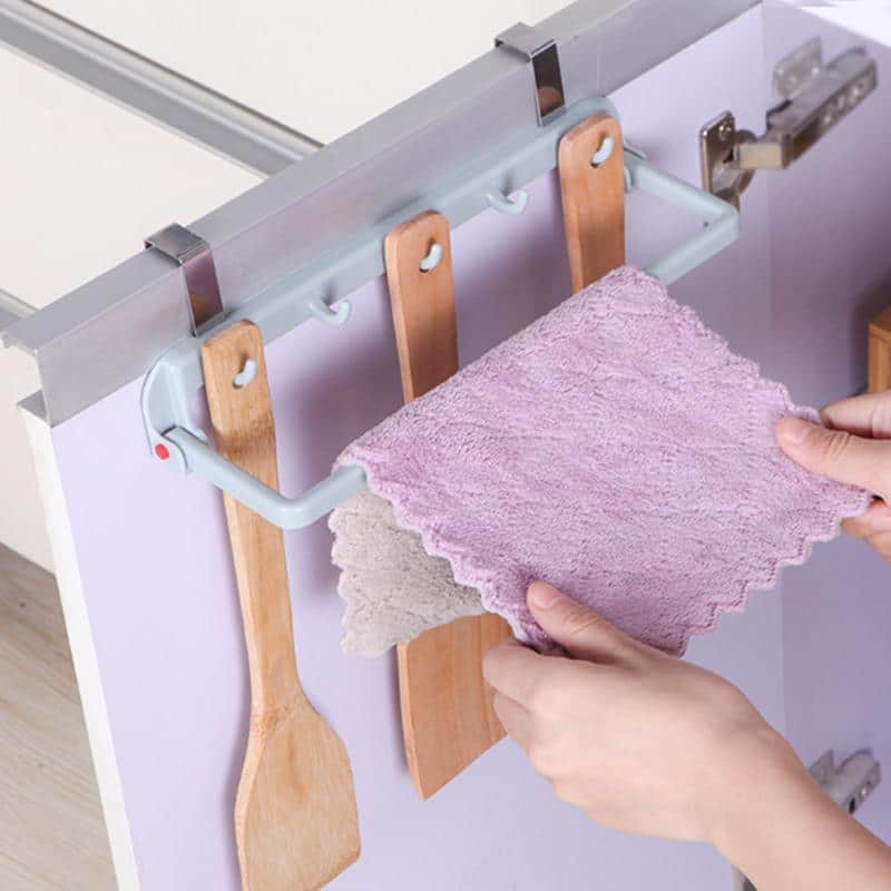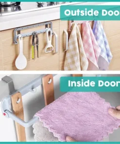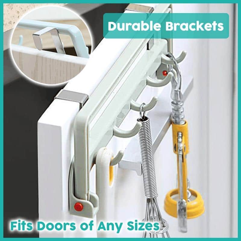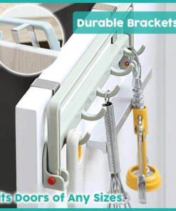 - The durable mounting bracket design allows the rack to fit easily over doors or shelves of any thickness and provide unmatched storage of your utensils, towels etc. It comes with 5 hooks and a collapsible bar for larger items.