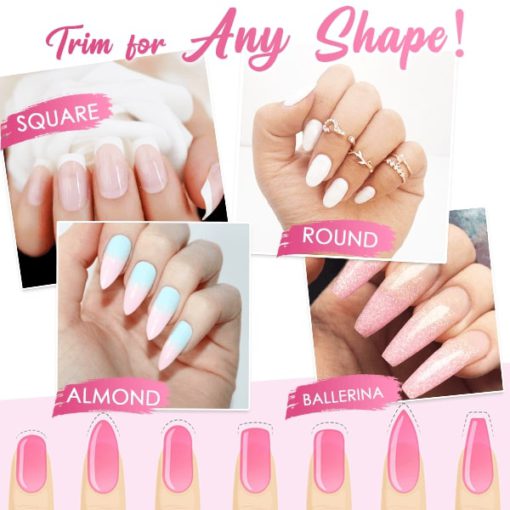 Free to trim to customize nail extension length from 0.5cm – 8cm! Also able to DIY any shapes – Round, almond, oval, square etc! Apply fiber builder gel and cure for 1-2 mins to strengthen the extension