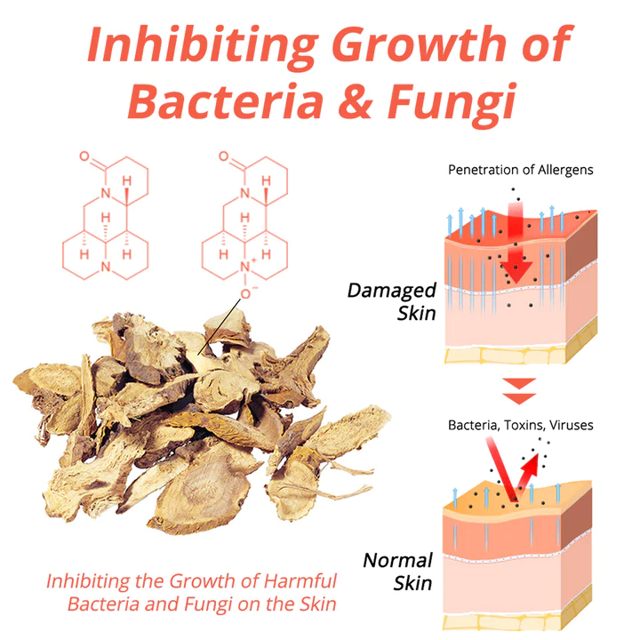 Radix Sophorae Flavescentis can help to reduce inflammation, itching, and infection in the affected area. It works by inhibiting the growth of harmful bacteria and fungi on the skin while also helping to soothe and calm irritated skin. In addition, it can help to alleviate the symptoms of heat rash, such as redness, itching, and inflammation, while also preventing further complications from developing.