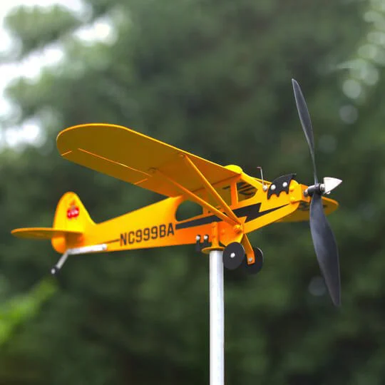 Piper J3 Cub airplane weather vane, windmill, tropics. It is made of 6061 aluminum, It can be used as a fence, countersunk, pole, etc. with the mounting apparatus supplied with the product. It is made to be mounted on.