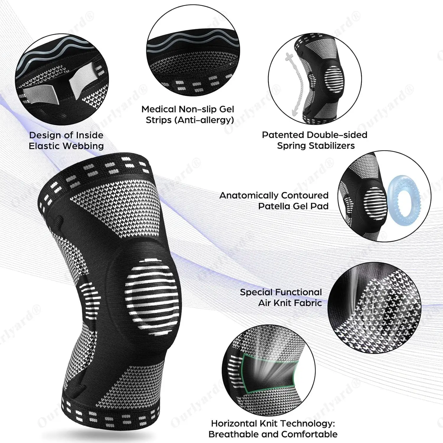 - EXCLUSIVE PATENT— Spring knee support technology: An anatomically contoured patella gel pad surrounds your kneecap, dual spring stabilizers fit tightly with your knee joint. These special functional element strengthen side support and maintain joint stability, It effectively disperses knee pressure, keeping your knee warm, which will prevent potential sports injuries without limit your performance! BEST CHOICE for sports protection and knee pain relief.