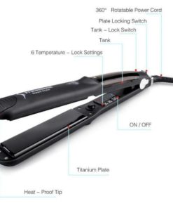 Made of a high-end rubber matte surface for comfortable holding, worldwide dual voltage appliance and the removable water tank for easy refills. This straightener has a 60 minute shutdown for safety, including a 360 degree swivel salon grade cord for accessibility!