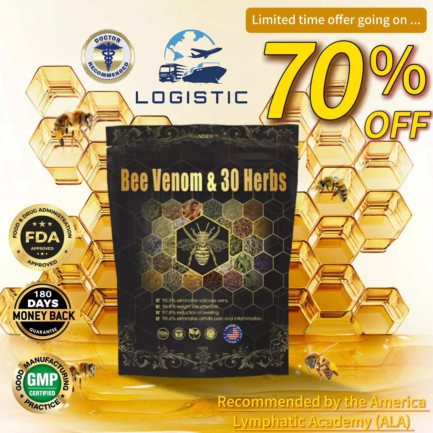 The synergy of Bee Venom and 30 Herbal Extracts promotes detoxification through acupressure points on your feet, improving circulation and metabolism. The natural ingredients, like Rosemary, Peppermint, and Eucalyptus, enhance fat burning, regulate blood sugar, and promote healthier skin.