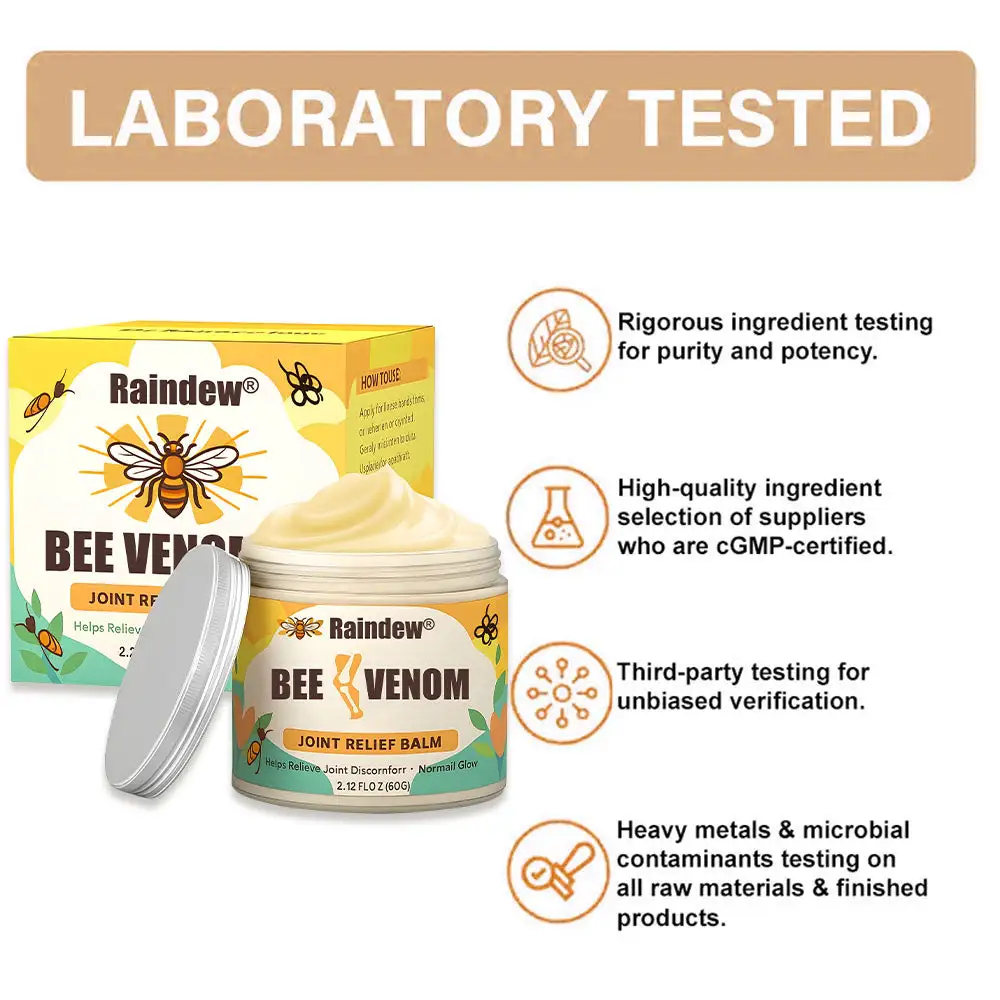 Designed to effectively relieve neuropathy, joint and muscle discomfort, promote healthy blood circulation, reduce inflammation, and enhance overall mobility, Raindew® BEE VENOM JOINT ELIEF BALM meets the strictest medical standards set by the FDA, NIH, and USP. Based on NIH-supported research, it aligns with the latest medical research standards, reflecting strong trust in its quality and reliability, ensuring safe and effective results.