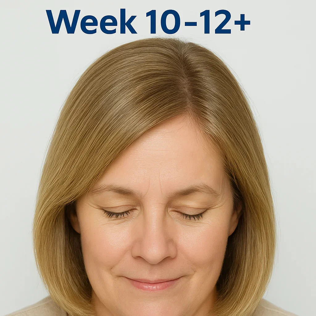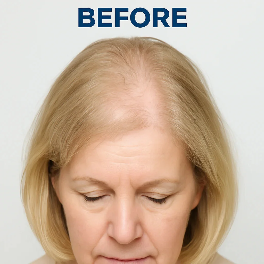 ✔️ Visible peach-fuzz growth in thinning zones (crown, part line)