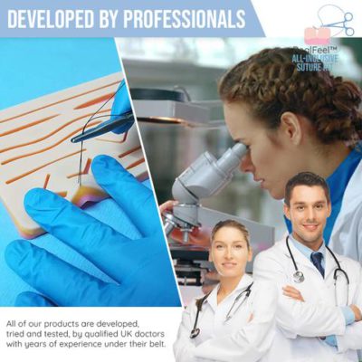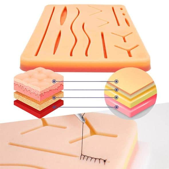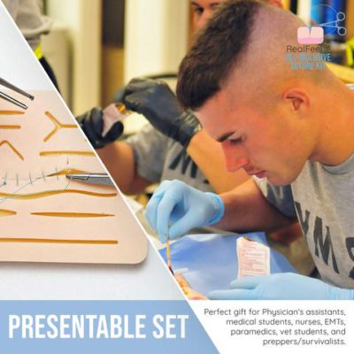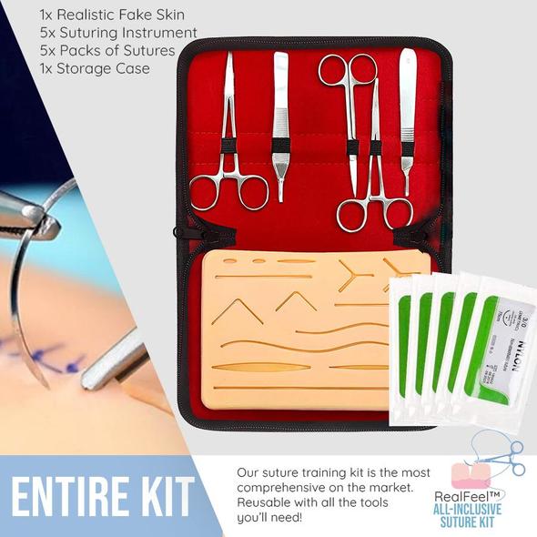 The kit has everything you’ll need to start suturing immediately, including, realistic fake skin with 14 wounds, 5 high-grade mirror finish stainless steel suturing instruments and a unique all-in-one suture kit case!