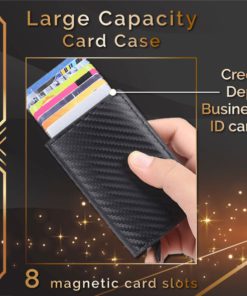 Give yourself some peace of mind and prevent thieves from snooping on your financial information. With our RFID Ultra Slim Pop-Up Wallet, you can now easily carry and protect all your cards and cash without sacrificing style. Made with carbon coating, which effectively blocks RFID to prevent unwanted card transactions and hi-tech thieves. It can hold up to 8 magnetic card slots with one touch feature to open all cards easily without falling. Suitable for credit, debit, ID, gift cards, business cards and more, with an extra compartment for your cash.