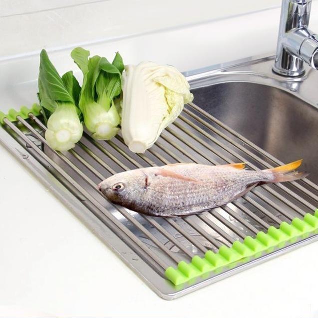 I thought I’d give this item a try as a replacement for a counter-top drying rack for items I did not want to put in the dishwasher. Well, it works really well for that – I can even stand things up between the slats to allow water to drain all front and back. But, the really exciting thing to me is that I use this for multiple purposes. For example, I have almost eliminated using most of my cutting boards – instead, I lay items ranging from racks of ribs, to flowers, to cheese across the piece and just cut down through the round metal slats. When I’m finished, I wash it, lay it back to quickly dry, and then roll it up and stick it in a drawer. I also use it as a trivet for hot pans, especially if it’s something I want to be stirring or adding water to as I stir since it lies over the sink. This item is very sturdy and holds its grip of the front and back edges of my sinks. Love it, love it, love it!