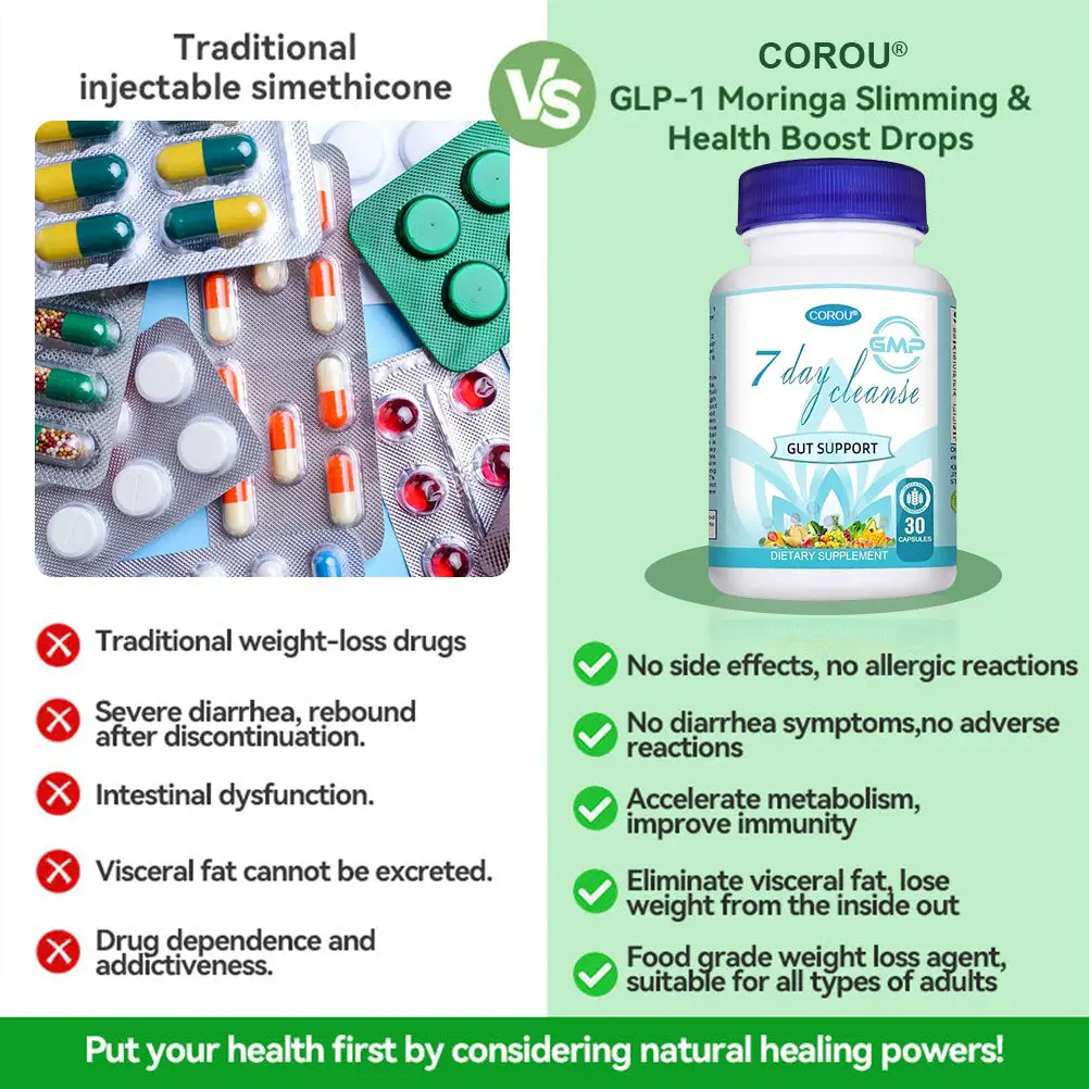 COROU® 7-Day Cleansing Capsules are infused with Moringa. a natural superfood that boosts metabolism. promotes fat burning. and helps regulate blood sugar. while enhancing joint and bone health and increasing overall vitality. According to FDA research. the combination of Moringa and GLP-1 provides more comprehensive support for overall health.