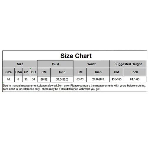 Waist: 63cm – 73cm/24.8″ – 28.8″ , Bust: 80cm – 92cm/31.5″ – 36.2″, Suitable for 155-165cm, No More than 60kg (Approx.)