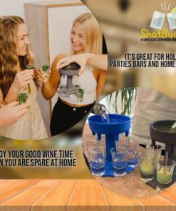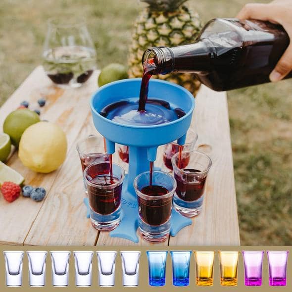 You place your shot glasses under the container — then you pour your alcohol of choice into the top. Then it dispenses that liquid gold to all the shot glasses below and boom, you have shots for six almost instantly.
