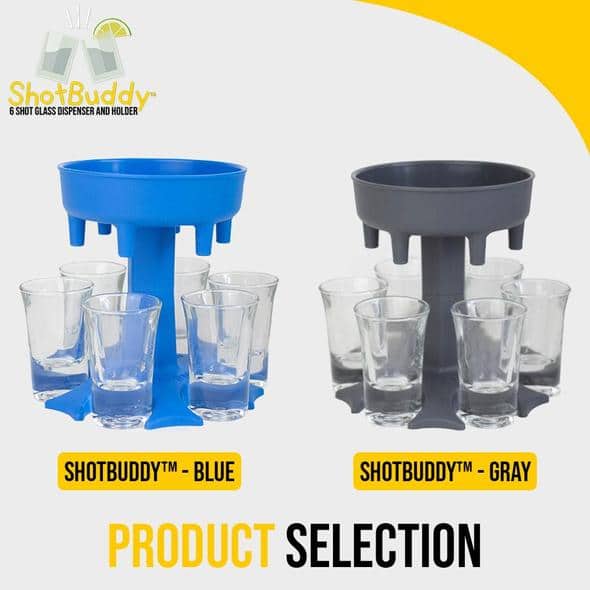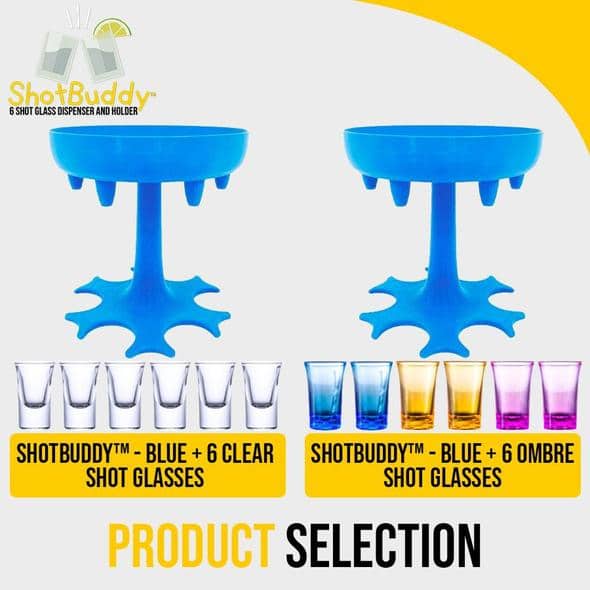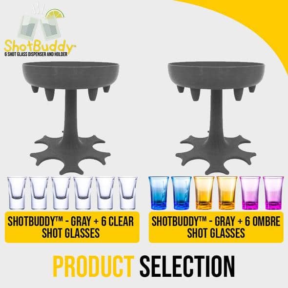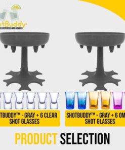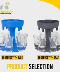 | Set | JUST SHOTBUDDY – BLUE, SHOTBUDDY – GRAY, SHOTBUDDY – BLUE + 6 CLEAR SHOT GLASSES, SHOTBUDDY – BLUE + 6 OMBRE SHOT GLASSES, SHOTBUDDY – GRAY + 6 CLEAR SHOT GLASSES, SHOTBUDDY – GRAY + 6 OMBRE SHOT GLASSES |